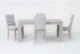 It's easy to entertain with our Aysha natural wood dining set, which brings style and function to your space. Decked in a soft grey finish, hardwood, ash veneer and MDF combine to provide strength and character. Clean lines and a rustic wood grain texture offer versatile charm that allows each design to fit perfectly anywhere. Upholstered seating ensures comfort and support during long meals.