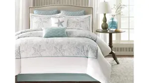Bring the ocean into your home with the Maya Bay Collection. A soft seafoam blue is the accent color used in this beach themed comforter and shams playing up the seashell and sand dollar embroidery. Made from 200 thread count cotton, this calming collection allows you to escape from reality in your own home.