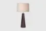 Introducing the Timber Black 31" Pine Wood Tapered Cone Table Lamp with a Drum Shade. This mid-century modern table lamp features a sleek black finish and a solid pine wood base. The beige drum shade complements the dark wood, making it a perfect addition to any bedroom or living room.