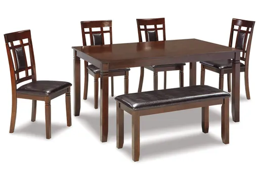 Set the scene for ultra-contemporary style with the Bennox dining room table set. Table’s rich, dark finish and clean, gently tapered profile is the epitome of great taste. Cutout-design chairs with upholstered seats and back supports are a cut above. Addition of upholstered bench incorporates a generous helping of casually cool flair.