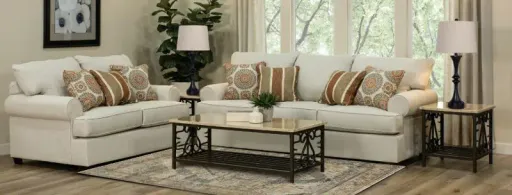 The Alison 7-piece living room set will add timeless, inviting design to your living spaces. The sofa and loveseat feature classic, comfortable shapes in a fresh and versatile off-white upholstery, while the coffee table and end tables blend dark brown metal framing with creamy faux-marble table tops for an elegant look. The table lamps pair a white and green ceramic base with a white shade, further enhancing the living room set’s charming, time-honored appeal. Includes sofa, loveseat, coffee table, 2 end tables, and 2 table lamps. Rug not included.