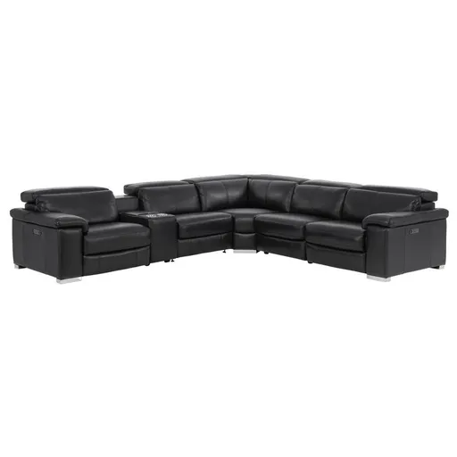 The transitional style and comfort features of the Charlie Black Leather Power Reclining Sectional will officially make your living room your favorite hang out spot at home. This black sectional is made with 100% leather and also has a special baseball stitching detail to it. It has power motion in both its left and right recliners along with its headrests for your convenience so you can choose how you would like to relax on your free time. It features padded armrests and high density seat cushions for the upmost comfort. This sectional is supported with block style chrome legs and has built-in USB ports for your device charging needs.