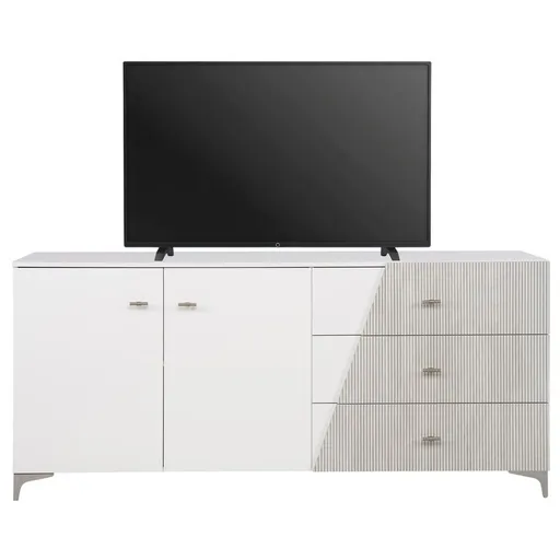 You can't beat the elegance and sophistication of the Triana Buffet. This wooden server features three storage drawers with fully finished interiors. Its smooth, glossy look and modern style, combined with its gray/white color combination and asymmetrical design, make it the perfect addition to your decor.