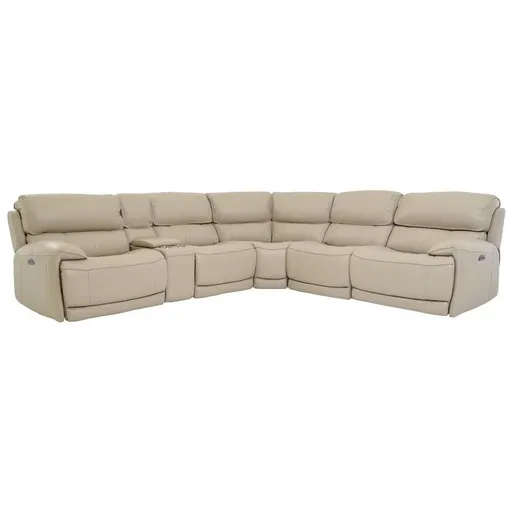 Bring an abundance of comfort to a large living room with the Cody Cream Leather Power Reclining Sectional. This reclining sectional is upholstered in genuine top grain leather where the body touches for a soft feel to the touch with foam padding in both the seats and back while the ivory cream tone is neutral for complementing your existing décor. The headrests and three of the recliners, left, armless, and right, are powered with push buttons so you can pick your preferred level of comfort. A storage console with beverage holders and built-in USB ports on both sides make it easy to store items and entertain.