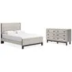 Includes queen panel bed (headboard, footboard and rails) and 6-drawer dresser Made with engineered wood (MDF/particleboard/plywood) and decorative laminate for the right balance of affordability and durability Light gray finish over a replicated oak grain with authentic touch; bases of footboard and dresser have matte black finish with subtle replicated wood grain Decorative laminate replicates natural or man-made material surfaces with consistent color, pattern and texture Handles with matte black finish Smooth-gliding drawers Drawer interiors are lined with a faux linen laminate for a clean, finished look Foundation/box spring required, sold separately Mattress available, sold separately Safety is a top priority, clothing storage units are designed to meet the most current standard for stability, ASTM F 2057 (ASTM International) Drawers extend out to accommodate maximum access to drawer interior while maintaining safety Assembly required