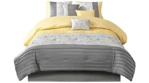 Elegantly update your bedroom with the Serene queen 7-piece comforter set. A beautifully embroidered floral pattern is showcased on the faux silk comforter. The pieced design, in yellow and gray hues, adds a lovely contrast and texture to the ensemble. The solid dark gray reverse complements the enticing design seen on the top of the comforter and continues gracefully down to the bed skirt. Matching shams bring the unique style of the comforter to the head of the bed, giving it a truly luxurious look. Three Decorative pillows with intricate embroidery, pleating, and piecing, complete this exquisite comforter set.
