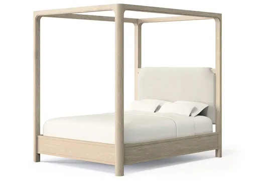 Airy and architectural, this canopy bed brings sculptural presence and soft romance to the bedroom. Gracefully arched posts frame a tall silhouette, while an upholstered headboard adds a tailored layer of texture and comfort. Designed with a platform panel base, it offers lasting support without the need for a foundation. Crafted from mahogany, engineered wood, mango veneer, and fabric, this piece blends strength and serenity in perfect harmony.