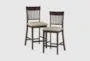 The Floyd Brown Slat Back Counter Height Stool Set Of 2 brings a touch of farmhouse charm to your kitchen or dining area. Crafted from poplar wood and engineered wood, these stools feature a dark brown finish that complements their traditional design. The slat chair back and fabric upholstery add both style and comfort, making them a perfect addition to any home.