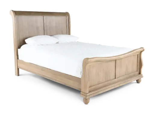 The Traditions collection pays homage to heirloom craftsmanship with its enduring silhouettes and rich detailing. The king-size bed draws inspiration from classic Louis Phillippe styling and is expertly crafted with a welcoming saddle tan finish. Its sleigh-inspired design and timeless bun feet promise to add classic, inviting charm to your bedroom space. Includes headboard, footboard, and rails.