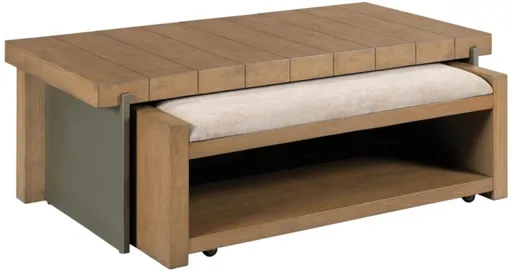 The Hammary Spence Coffee Table and Bench from the Hidden Treasures Collection blends style and function. Crafted from white oak veneers and select solids, it features a rustic plank-style top, a cushioned bench, an open storage shelf, and metal accents. Casters provide mobility, making it perfect for versatile, space-saving living.
