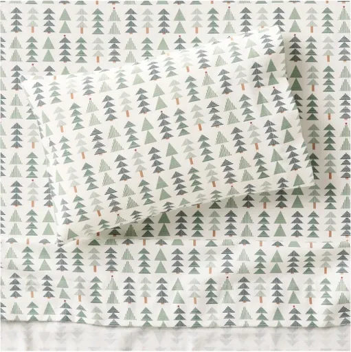 Bring the outdoors in with this cozy 100% organic cotton flannel sheet set, featuring a modern tree screenprint with a playful twist. Striped pines and tiny red stars lend a fresh, festive vibe that feels just right for the holiday season and all winter long. Soft, breathable brushed flannel helps kids stay snug and toasty, even when the temperature drops.