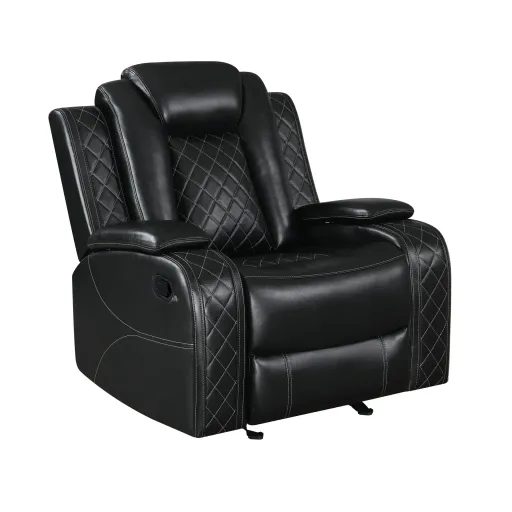 Meet the Orion Glider Recliner, where durability meets comfort. Crafted with a robust blend of hardwoods and manufactured wood, its sturdy frame ensures lasting strength. Sink into luxury with its soft, breathable upholstery, a lavish mix of polyester and PU for an indulgent feel. Enjoy seamless reclining action thanks to top-quality mechanisms, while high-density foam and pocket coil cushions cradle you in comfort. This recliner's sleek design is accentuated by white contrast stitching and a distinctive diamond pattern, elevating any space with its contemporary flair. And with lift-up pillowed arms revealing convenient storage compartments, style meets functionality seamlessly. Relaxation awaits in the Orion Glider Recliner—where quality craftsmanship meets modern convenience.