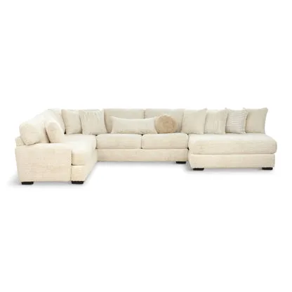 To immerse yourself in the luxury of the Doodle sectional is to fully embrace the softness and comfort of everyday tranquility. Ivory chenille woven into horizontal ridges covers every inch in rich texture, the low-profile arms inviting you to ease into total relaxation. Wide seat cushions and backs ensure space for everyone, while the extra wide chaise offers abundant room to stretch out.