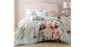 Misty green 5-piece reversible comforter set is the perfect backdrop for the exploding rose and hydrangea blooms on this stunning oversized print. The reverse print, with a charming tonal rose pattern, provides a more subtle floral motif on the 230 thread count 100% cotton sateen fabric. this cozy and soft 230 thread count 100% cotton sateen comforter set also includes 1 reversible comforter, 2 reversible shams, 1 embroidered square decorative throw pillow 18x18" that mimics the reverse print and 1 printed oblong decorative throw pillow 18x12".