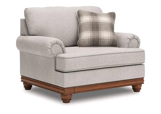 Fresh yet classic. That’s the beauty of this oversized chair. Dressy and also soft to the touch, its organic neutral-toned upholstery is sure to bring a transitional farmhouse aesthetic to your living space. An accent pillow in windowpane plaid infuses a cozy and inviting farmhouse sensibility, while a full wraparound base and decorative turned legs complete the chair's timeless look. It's the perfect place to curl up after a long day.