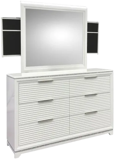 The Denmark White Dresser and Mirror Set is a stylish and functional piece of bedroom furniture. This set would be a practical addition to a bed space, offering both storage and serving functionality while enhancing the overall aesthetic of the room.