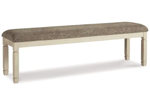 The beauty of the Bolanburg upholstered dining bench is something to savor. Serving up country cottage comfort and fresh farmhouse flair, this generously-scaled bench entices with a cushioned seat covered in a heavy woven fabric that complements the trendy textured, antiqued white finish.