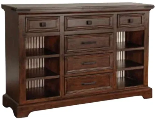 The gorgeous piece of furniture in a kingswood finish from the Mossy Oak's collection has so much to offer! Showcase this off in your dining area! The server features plenty of drawers for storing, wooden shelving, pull and knobs!
