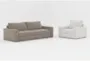 Introducing the Araceli II Taupe Beige Vegan Faux Leather 95" Sofa and Sand Beige Fabric Oversized Arm Chair. These modern pieces are perfect for your living room, offering both style and comfort. The sofa features a taupe faux leather finish, while the arm chair is upholstered in sand beige fabric, both designed to complement any decor.