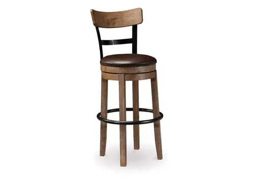 Pinnadel pub height bar stool serves a sense of refinement without all the formality. A 360-degree spin element keeps you in the flow of conversation, while faux leather upholstered seating incorporates comfort and easy cleanup. The frame’s signature finish with a wire-brushed effect and gray undertones exudes an easy, relaxed sensibility.