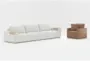 The Amallo Ivory White Fabric 151" 3 Piece Sofa and Alicia Saddle Brown Vegan Faux Leather 40" Swivel Chair set brings comfort and modern style to your living room. The mellow ivory fabric sofa offers a soft seating experience, while the saddle brown faux leather swivel chair adds a touch of versatility. This combination is perfect for creating a cozy and inviting atmosphere in any space.