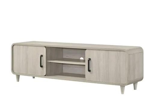 Elevate your living space with this sleek and contemporary entertainment solution that blends modern design with functionality. Featuring a streamlined silhouette and a chic, light wood finish, this piece exudes understated elegance while offering practical storage options. Sliding doors let you alternate between closed cabinets and open shelving, perfect for displaying décor or housing media devices. Enhanced with minimalistic black handles for a touch of contrast, this unit stands on tapered legs, adding a mid-century flair to its aesthetic. Whether you're setting up your home theater or showcasing your favorite accents, this centerpiece effortlessly combines style and utility to create a harmonious and inviting ambiance.