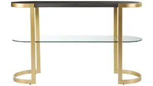 Augusta Console strike gold with this contemporary console table. The spacious tabletop provides ample space for family photos and a table lamp, while the clear glass shelf holds potted plants and d_cor. A gold metal frame curves around the ebony tabletop, crafting a sleek look. Add a focal point to your d_cor with this elegant console in your entryway or open concept living space.