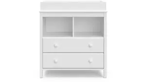 Our new Alpine 2 drawer changing chest has a beautiful, versatile, "pairs with anything" look that will be sure to match with any nursery style. This sturdy nursery chest features a changing table topper that is designed to fit all standard-sized changing pads. In addition to the changing table topper, this piece features two spacious drawers (complete with Euro glide drawer tracks and durable steel hardware) and two open storage shelves. Crafted from durable engineered wood the Alpine 2 drawer changing chest complies with all applicable ASTM International and CPSC safety standards. Also, the changing topper is JPMA Certified.