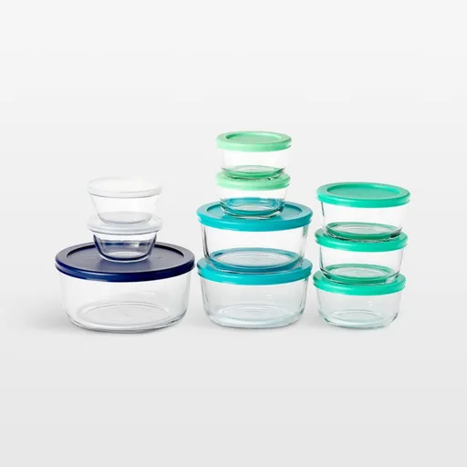 Bake, store and transport with this versatile storage set that goes from oven to table or potluck. Ten round glass containers accommodate a wide range of foods, from individual servings to large salads. Colorful lids make it easy to select the right size to fit the container and organize stored contents by food type. The 20-piece set consists of two 1-cup containers with key-lime lids; three 2-cup with mint-green lids; two 4-cup with teal lids; one 7-cup with dark-blue lid and two 6-oz. custard cups with clear lids.