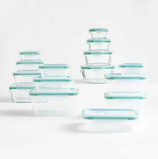 Interchangeable lids with four locking, leak-proof tabs secure to both glass and plastic food containers in this comprehensive set from OXO. See-through storage in a clean, table-friendly design comes in both rectangular and round containers in a variety of sizes, nesting for space-saving storage. Set includes 15 interchangeable lids; rectangular glass in 4oz., 2-, 3.5 and 8-cup sizes; round glass in 1-, 2-, 4- and 7-cup capacities; and plastic containers in 6 oz. 2-, 3-, 4.5-, 5-, 6- and 10-cup sizes.