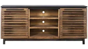 Our Reah 63" console is cultured and chic, with a modern Hollywood appeal as classic as Elvis himself. This two toned stunner with slatted doors would have been a hit down in the jungle room. It holds up to a 72" TV and has plenty of storage for media gear to entertain the night away with your favorite Elvis movie.