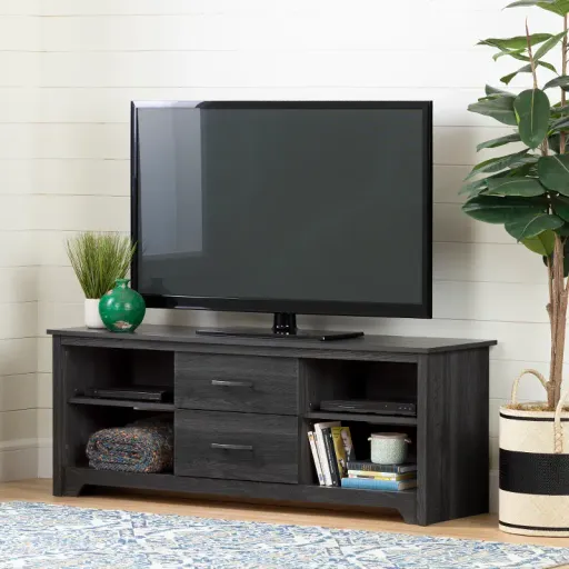 With a gray oak finish, this Fusion Collection 60 inch TV Stand from RC Willey will look great in your home. This TV Console accommodates TVs up to 60 inches and features both open and closed storage options. Hide your wires and cords with the included wire clips and cord management system. Big enough open spaces are the perfect place for your electronic and gaming devices. Live clutter free and enjoy nights in more than ever! Available for Online Purchase Only. Assembly required. This product ships direct from the manufacturer, so RC Willey Delivery is not available.