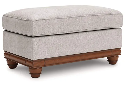 Fresh yet classic. That’s the beauty of this ottoman. Dressy and also soft to the touch, its organic neutral-toned upholstery is sure to bring a transitional farmhouse aesthetic to your living space. A full wraparound base and decorative legs complete the timeless look. It's the perfect place to kick up your feet at the end of a long day.