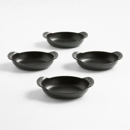 Part of Le Creuset's new single-serve Gourmand cookware collection, these mini bakers make a charming presentation of quiches, casseroles and bread puddings. Durable cast iron retains and distributes heat optimally—keeping food warm throughout the meal—while the matte black enamel coating renders the pans impervious to stains, chips and cracks. The interiors curve gently for ease of eating, while the upward-arching handles make it easy to go from from stove to oven to table. This set of four oval baking dishes is as fantastic for entertaining as it is for weeknight family dinners.