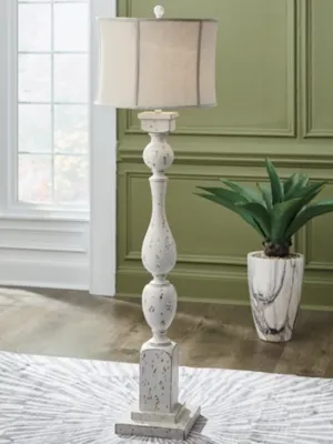 The Madsbrook floor lamp takes a classic approach to tasteful lighting. Its detailed base ushers an air of elegance into your space with a graceful turn design. Outfitted with an antiqued white finish, it's right at home in traditional spaces. Pair with the matching table lamp (sold separately) for double the style.