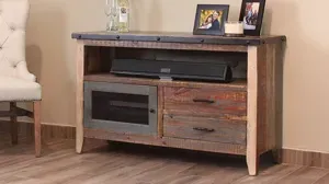 Casual and comfortable in design, the Antique TV Stand adds a reliable gathering space to the living room in your home. Express your strong and independent personality with this collection. Each piece is made to replicate antique/reclaimed wood parts and pieces, which means each item is unique. To provide this look, cracks, knots, knot-holes, splits and uneven rubbed edges are purposely left intact from original pieces of wood and in many instances additional man-made distressing is given to emphasize its rustic charm. These are not product defects but unique features that add beauty and character.