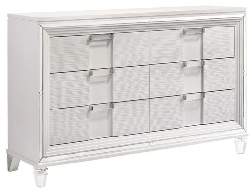 The sophisticated Twenty Nine bedroom collection features a white finish paired with acrylic hardware and feet. This dresser has solid plywood framing, and felt lined top drawers. The perfect addition to your bedroom.