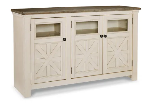 Whether your style is farmhouse fresh, shabby chic or country cottage, you’ll find the Bolanburg large TV stand perfectly in tune. Its two-tone finish pairs a trendy textured antiqued white with a weathered gray for that much more quaint character. Charming elements include crossbuck adorned cabinet doors with glass inlays for peek-through flair. Ample adjustable shelving and cutouts for wire management nicely accommodate your media needs.