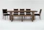 Enhance your dining experience with the Estate Brown Wood Extendable Dining Set, designed by Nate Berkus and Jeremiah Brent. This traditional set includes a spacious table, a comfortable bench, and upholstered side chairs, all crafted from estate oak wood. Perfect for hosting up to eight guests, this set combines style and functionality for your dining room or kitchen.