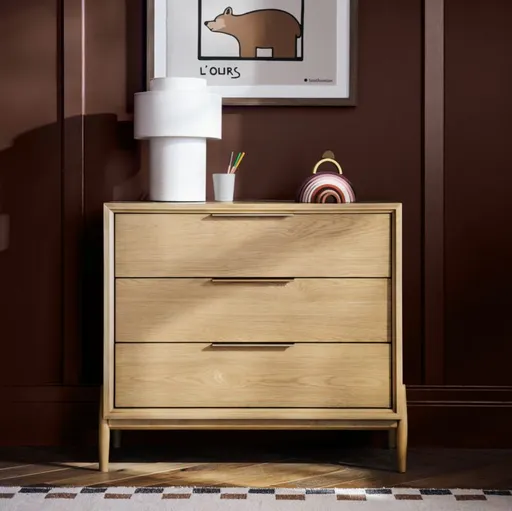 With clean lines and brushed gold drawer pulls, our Bodie Narrow Dresser is a timeless furniture design that's totally comfortable in the modern nursery or kid's room. The dresser's gorgeous natural grain will lend warmth to any room, while the roomy drawers simplify organization. Crafted to last and grow with your family, it has a style that will complement the look of your whole home. Pair it with other pieces from our Bodie collection to complete the look.