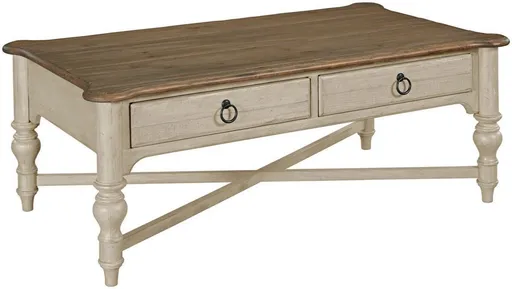 Weatherford was inspired by an old farmhouse and the weathered wooden fence that traced around it. This solid wood coffee table brings that casual, timeless style into the living room. Simple turnings and purposeful cross-stretchers keep the look relaxing and the table sturdy. It also includes two convenient soft-close drawers.