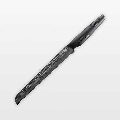 Cuisine::pro's iD3 Black Samurai knives are razor-thin and exceptionally sharp for fast and agile cutting, slicing and dicing. Made of premium Japanese steel, the knives are manufactured with techniques inspired by traditional Japanese craftsmanship and samurai sword making. The blades are tough, shatter-resistant and honed to a fine, razor-sharp edge with Damascus-style patterning suggestive of flowing water. A ceramic black coating makes the knives stain-resistant, nonreactive and antibacterial. The serrated bread knife saws through crusty loaves or tomatoes without tearing or crushing. Plus, the asymmetrical handle with MicroDot technology conforms to main pressure points in the hand for maximum control and comfort.