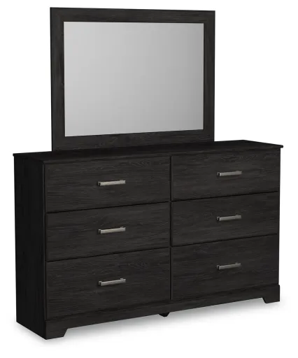 With its clean-lined look and modern attitude, this dresser and mirror is a fresh style awakening. A warm charcoal hue over replicated oak grain easily complements other furniture finishes. Smooth drawer fronts with antiqued pewter-tone handles complete the aesthetic.