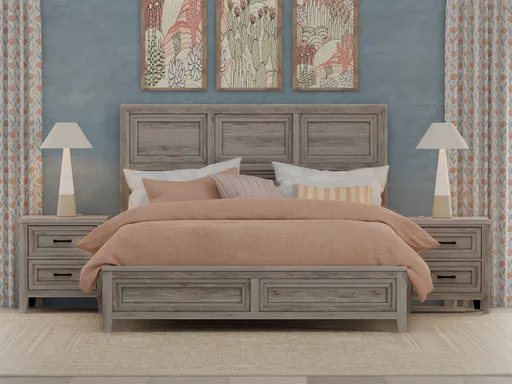 The Franklin Bedroom Set combines modern elegance with practical design. Available in both King and Queen sizes, this set includes the Franklin bed with its gray wood veneers and square paneling on the headboard and footboard, offering a simple yet sophisticated look. Additionally, the set comes with a spacious dresser featuring seven drawers with square detailing and black hardware, topped with an elegantly framed mirror. Together, these pieces create a cohesive and stylish bedroom ensemble that enhances any contemporary space.