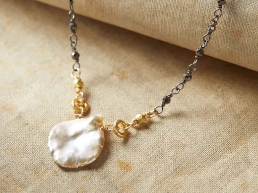 The delicate, freshwater pearl pendant hanging from our Nadya Necklace is complemented by sparkling pyrite on a 22kt gold-vermeil and oxidized sterling-silver chain. Inspired by stars and celestial bodies drifting through the night sky, jewelry artisan Robindira Unsworth, from Petaluma, California, has handcrafted this one-of-a-kind Holiday Collection, combining her rustic aesthetic with unique, natural materials.