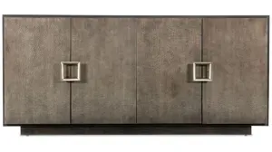 Crafted of Figured Primavera Veneers with a Canvas Crackle finish, the Melange Four Door Entertainment Credenza has a tactile, tasteful appeal. Soft, casual and modern, the silhouette has 4 doors with soft-close hinges and magnetic door catches with one adjustable shelf behind and one drawer behind each pair of doors. Accommodating up to a 75-inch TV, the credenza has a vented back panel and FC705 3-plug electrical outlet behind the right side doors. A plinth base and champagne-colored buckle pulls add a sleek touch.