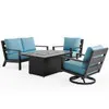 Experience the oversized comfort and structural strength of our exclusive Montecito Collection, featuring a handmade aluminum frame with a durable multi-step powder-coated and oven-baked clear coat finish. Each piece in this 4 piece swivel loveseat group with a fire pit is built by laser welding to create fully welded and braced frames with zero weld marks. The loveseat and swivel club rockers feature PVC sling seat suspenion and include oversized deluxe Sunbrella® acrylic cushions. The textilene material's flexibility and sturdiness make it a comfortable material for seating.