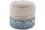 Introducing the Pouf-Denim Blue Beige Braided Jute Fiber Cotton Blend, a versatile and stylish addition to any room. This round pouf features a traditional design with a mix of white, denim, dark blue, tan, dark brown, and teal colors. Perfect for bedrooms and living rooms, it combines comfort and functionality in a compact size.
