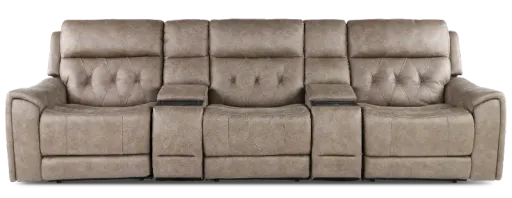 Give yourself the ultimate seating upgrade with this 5-piece Power Reclining Home Theater Set from the Anniston collection! Designed for comfort and convenience, all 3 seats feature power recline and power adjustable headrests, allowing you to easily relax. Two retractable cupholders provide added functionality without sacrificing style, and the center consoles offer generous storage along with wireless charging pads to keep your devices powered up. Wrapped in soft upholstery with sleek stitching details, the Anniston Collection is a luxurious addition to your home theater!