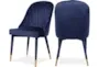 The Relle Navy Velvet Upholstered Dining Chair Set Of 2 brings a touch of modern elegance to your dining space. These chairs feature a luxurious navy velvet fabric that is both soft and durable. The contemporary design is enhanced by a curved channel tufted back and upholstered legs with gold tips, making them a stylish addition to any home.